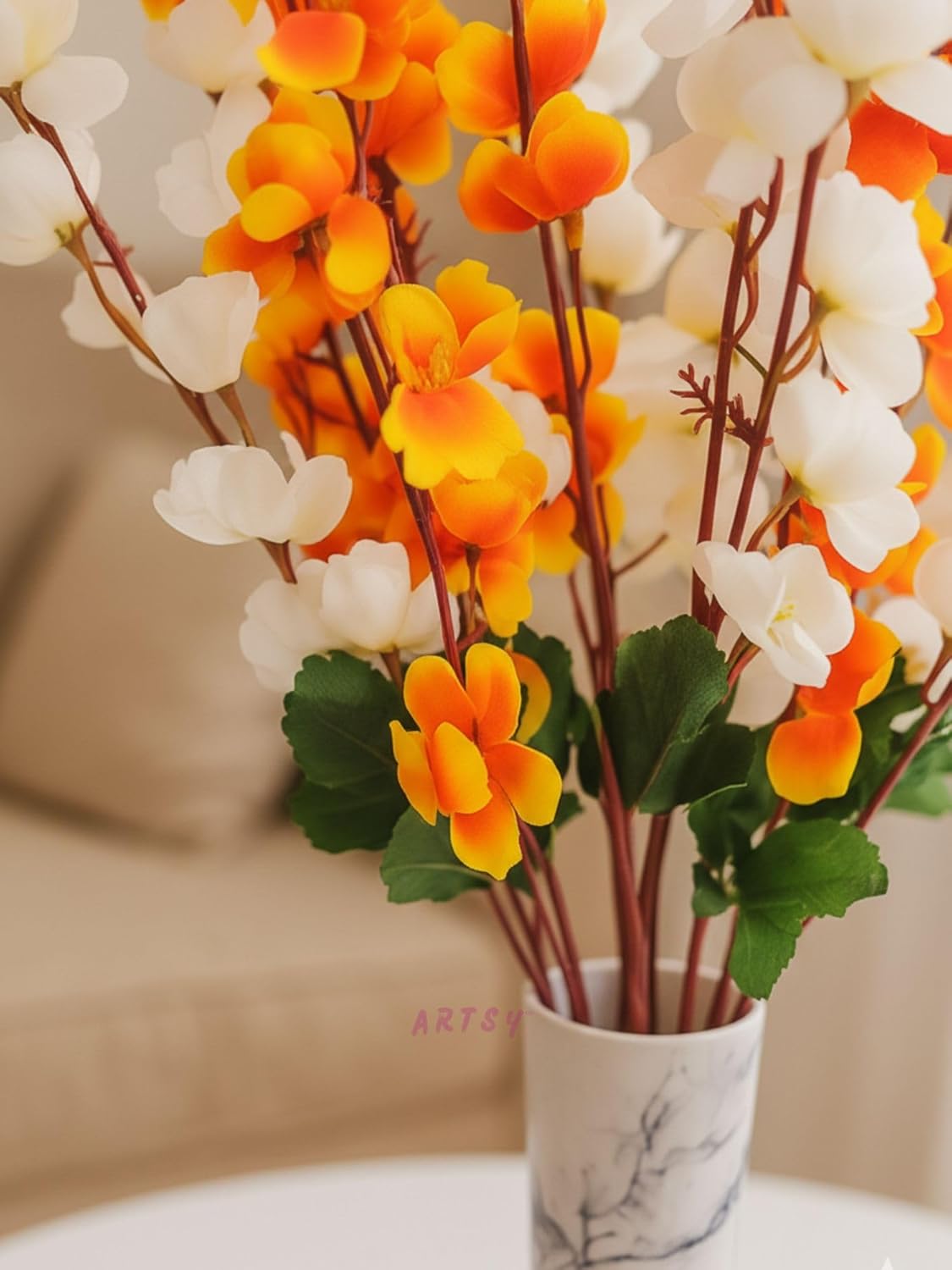 Artificial Cherry Blossom Flowers set of 2 in white & orange color, perfect for home decor, vase decoration, office styling, gifting & DIY craft. No maintenance required and long-lasting beauty.